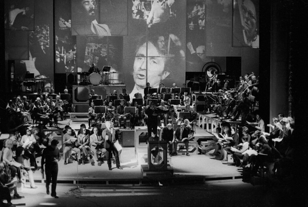 pour 2 acteurs, chœur mixte, bande magnétique, dispositif électroacoustique et orchestre